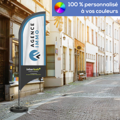 Le beach flag / oriflamme en forme d’aile d’avion de 2,40 m de hauteur imprimé Recto/Verso est le produit idéal pour rendre visible votre agence. Utilisation intérieure et extérieure.