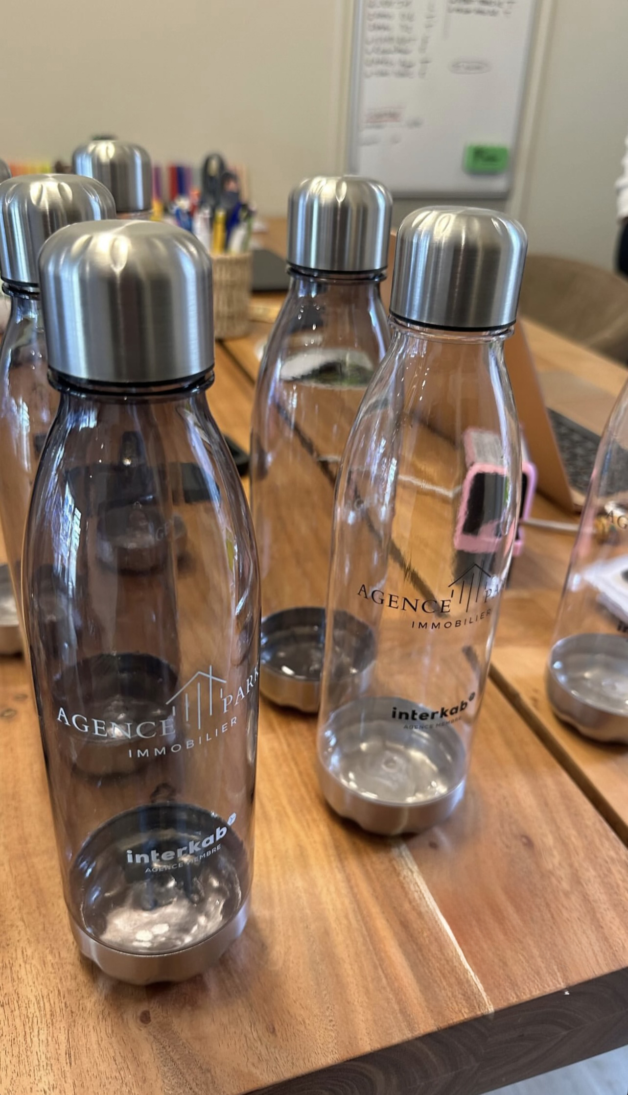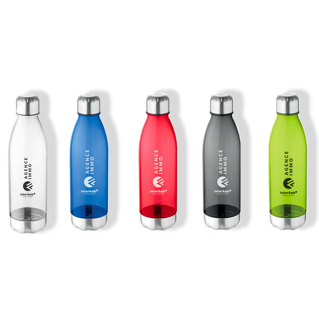 Bouteille en Tritan™ avec couvercle et fond en acier inoxydable. Contenance 600 ml. Ne convient pas aux boissons gazeuses. Anti fuite.