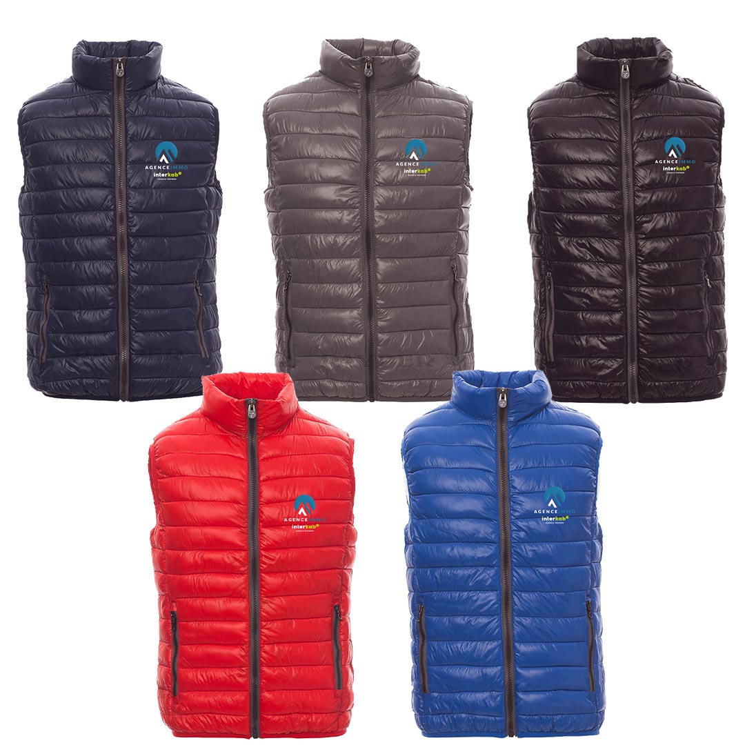 Doudoune sans manches pour homme à zip de 8 mm en plastique avec curseur en métal, fin liseré à la taille, deux poches extérieures. Intérieur rembourrage polyester effet duvet, trois poches.