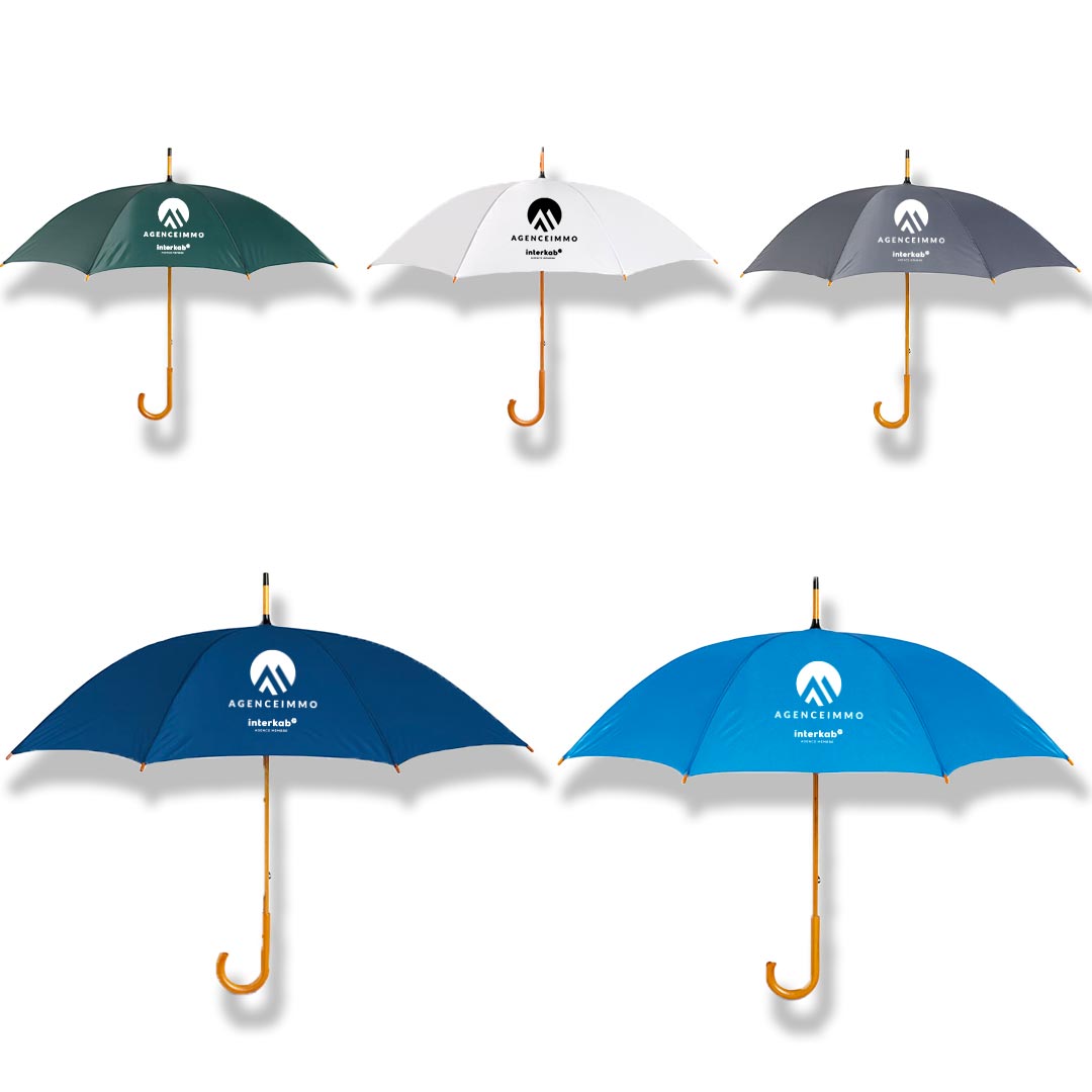 Personnalisez votre parapluie ! Avec son manche et sa poignée en bois, rendez visible votre agence même sous la pluie.