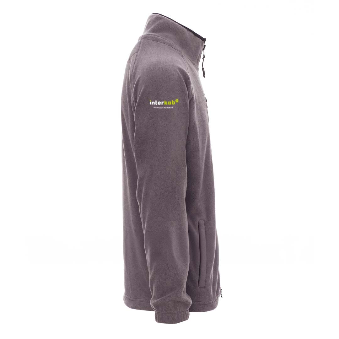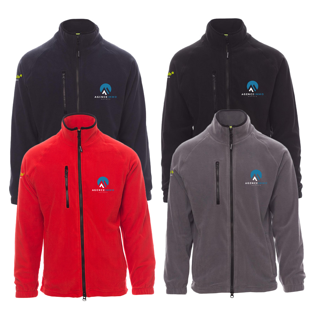 Veste polaire pour homme à zip intégral de 8 mm en plastique noir, manches raglan, coulisse réglable à la taille, élastiques serre-poignet, deux poches avec zips couverts, une poche avec zip sur le devant, col avec bordure de renfort en contraste, coutures renforcées.